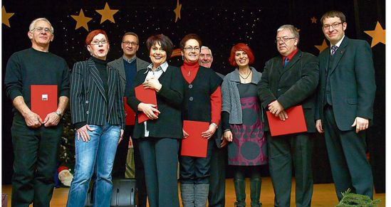 „Morgen, Kinder, wird's nichts geben! Nur wer hat, kriegt noch geschenkt.“ Dieses sozialkritische Ge-dicht von Erich Kästner trug der Vorsitzende des SPD-Ortsvereins Wiebelskirchen, Sören Meng, bei der Begrüßung der Gäste zu der Weihnachtsfeier und Jubilarehrung im Kulturhaus Wiebelskirchen vor. In seiner politischen Rede griff er auch mit Blick nach Berlin das Wort des Jahres „Wutbürger“ auf. Und dann gab es doch noch was. Geehrt wurden von Sören Meng (rechts), von der Kreisvorsitzenden Cornelia Hoffmann-Bethscheider (Dritte von rechts), und von der Stadtverbandsvorsitzenden Gisela Kolb (Zweite von links) acht Mitglieder für 40-jährige Zugehörigkeit zur Partei, sechs für 25 Jahre und ein Mitglied ist 15 Jahre in der Partei der Sozialdemokraten. Für 40 Jahre ausgezeichnet wurden: Sigrid Altmann, Ute Budzynski, Günter Hermann, Friedrich John, Gerhard Korb, Dieter Lüder, Dietmar Schminke und Karin Weiss. Für 25 Jahre Engagement geehrt wurden Sascha Ahnert, Helga Blinn, Marianne Müller, Rolf Schaly, Markus Staub und Herbert Thiedt. Jörg Volz ist 15 Jahre Mitglied bei den Sozialdemokraten. Nach der Ehrungszeremonie und dem Festessen sorgte die Gruppe Joy mit ihren Weihnachtsliedern im gemütli-chen Teil der Feier für eine familiäre Atmosphäre. hi/ Foto: Willi Hiegel (Saarbrücker Zeitung, 24.12.2010)